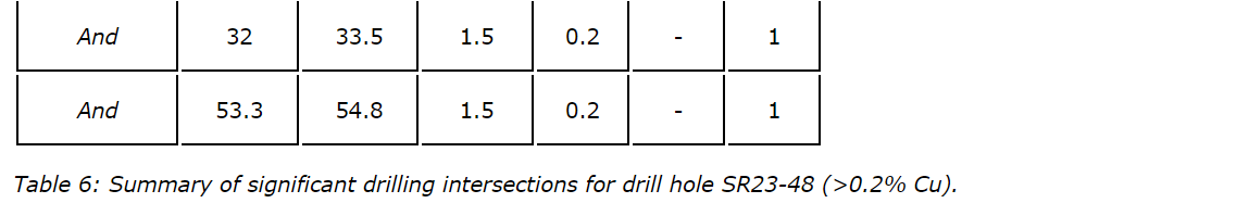 Drill holes SR23-24 and SR23-36 were completed to the north of the main 2200N zone and were planned to test the potential for parallel lenses to the north of the east-west-orientated fault system. The drill holes intersected minor veinlets of fracture-controlled copper sulphides and require follow-up drilling.