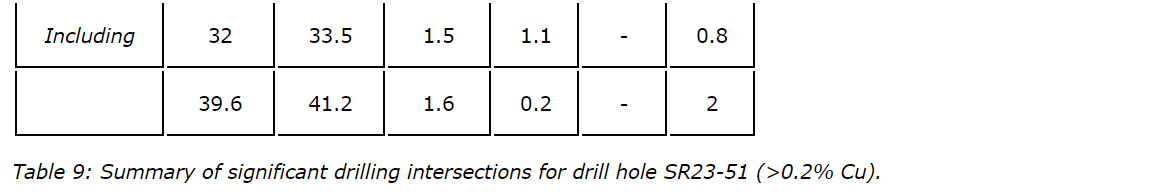 Exploration reverse circulation (RC) drill hole SR23-52 was drilled to a depth of 119 m and completed in a largely untested area of significant outcropping chalcocite (see an attached table). The drill hole was designed to test an airborne VTEM (versatile time-domain electromagnetic) target in an area with a single, shallow historical drill hole (ST97-06 2.6 m at 6.83 per cent Cu from 35.4 m), midway between the high-grade 2750N and 2200N zones.