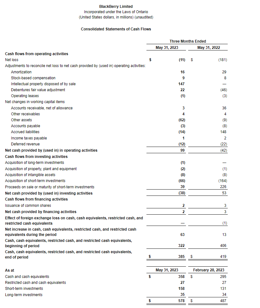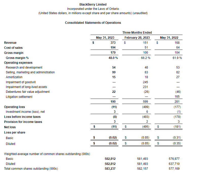BlackBerry Ltd. today released its financial results for the three months ended May 31, 2023 (all figures in United States dollars and U.S. GAAP (generally accepted accounting principles), except where otherwise indicated).