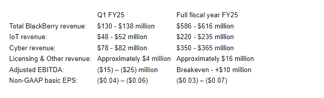 BlackBerry is providing the following guidance for the first quarter (ending May 31, 2024) and the full fiscal year 2025 (ending Feb. 28, 2025).