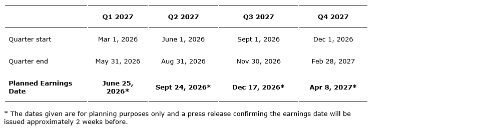 The attached table provides target dates for quarterly earnings announcements for fiscal year 2027.