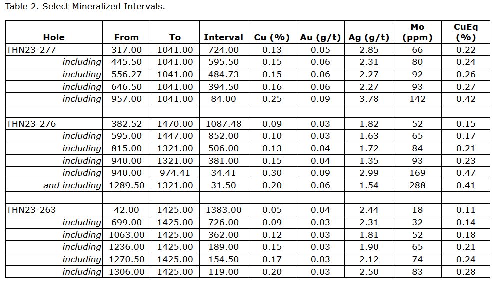 THN23-285 intersected 717.00m of 0.50% CuEq (0.20% Cu, 0.05 g/t Au, 1.92 g/t Ag, 458 ppm Mo)