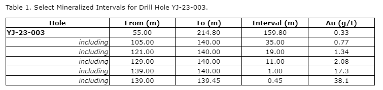 Hole YJ-23-003 yielded 159.80 metres of 0.33 gram per tonne gold from 55.00-metre depth: