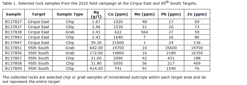 In 2025, soil and rock sampling expanded the surface footprint of the Catalyst and Tempest targets and delineated additional porphyry-style prospects. Of particular note is the Cirque target, drilled in 2024, which revealed copper mineralization associated with intrusive breccias (see news release dated Sept. 17, 2024). Recent mapping and sampling east of the drilled area have confirmed porphyry-style alteration and outlined a footprint coincident with a one-kilometre-long leach cap. Rock-chip samples from this area returned up to 2.16 per cent copper and 39 g/t silver (sample B137847; see Table 1). Intrusive rocks at Cirque-East are characterized by fine-grained monzonites hosting chalcopyrite and molybdenite within quartz veins. The observed Cu-Ag-Mo mineralization, together with granitic intrusive phases and the development of a leach cap, is typical of porphyry deposits. Continuing work will focus on refining these field results and evaluating the area for potential drilling in the 2026 campaign.
