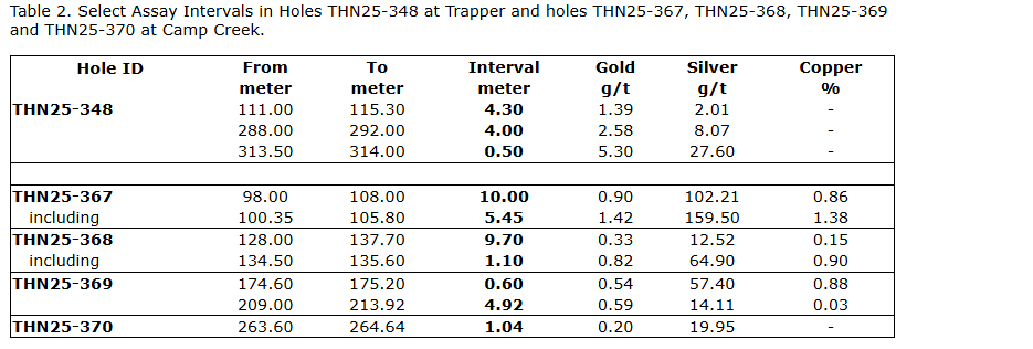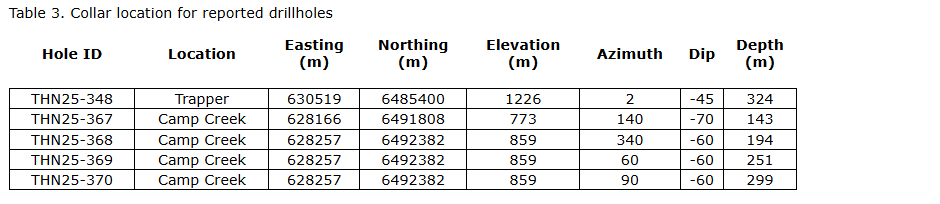 The final drill holes completed in 2025 at the Camp Creek high-sulphidation target include THN25-367, THN25-368, THN25-369 and THN25-370 (see Table 2). These holes intersected mineralized sections ranging from metres to tens of metres, associated with polymetallic veins interpreted as the shallow, high-sulphidation expression of the deeper Camp Creek porphyry system. Drilling at Camp Creek covered 3,223 metres across 19 holes and successfully identified high-sulphidation polymetallic veins. Future drilling in this area will focus on further testing the extent and grade of these high-sulphidation veins and on evaluating similar interpreted structures.