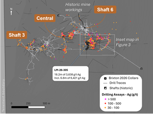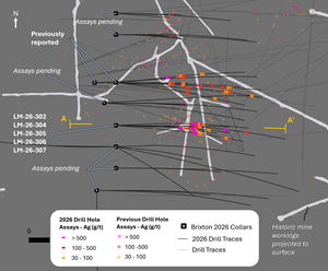 - Hole LM‑26‑305 represents the best silver intercept encountered by the Company to date in terms of grade‑thickness, returning 18.2 m of 3,638 g/t Ag from 113.8 m depth.
