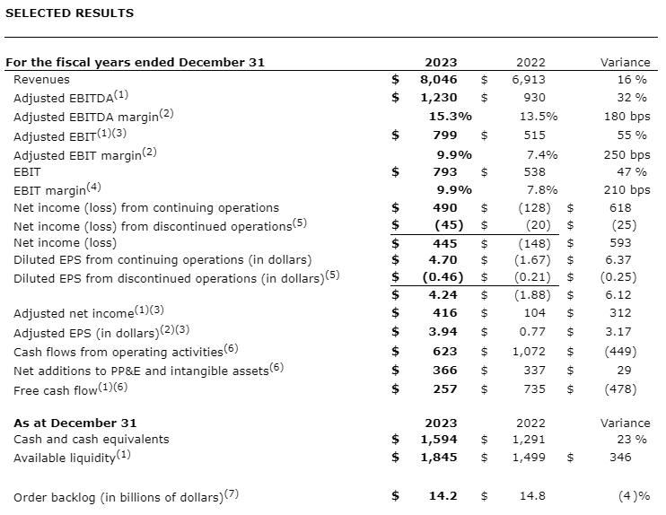 Thanks in particular to Bombardier's impressive performance in the fourth quarter, especially in terms of earnings growth and strong order intake, full-year free cash flow generation from continuing operations reached $257-million, beating the company's 2023 guidance. Cash flows from operating activities and net additions to PP&E and intangible assets for the full year were also significant at $623-million and $366-million, respectively.