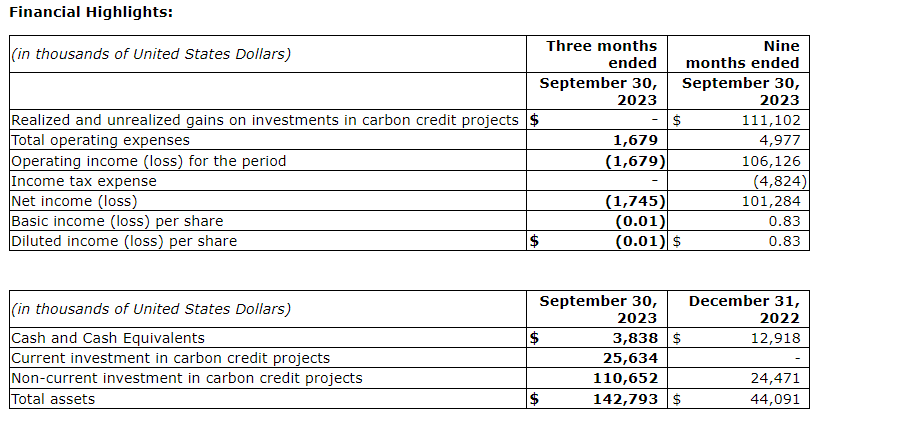 BASE CARBON REPORTS THIRD QUARTER 2023 FINANCIAL RESULTS