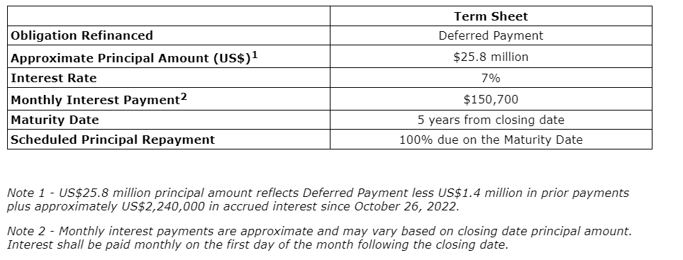 Subject to applicable corporate and securities laws approvals, at any time at or before the maturity date, the unpaid principal may be converted into common shares of the company, at a price equal to 73 cents, such amount being 1.25 times the volume-weighted average price of the common shares of the company for the 10-day period ending on May 29, 2023. If such conversion would create a new control person (as defined by applicable securities laws) of the company, no conversion may occur until applicable shareholder approval of the company is obtained.