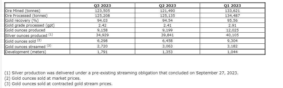 Production and development results for the quarter ended Sept. 30, 2023, are as noted herein.