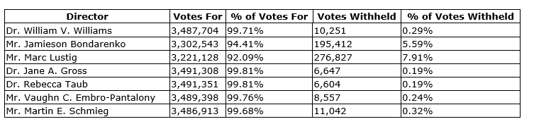 At the meeting, the shareholders overwhelmingly voted in favour of all proposed resolutions, consisting of the reappointment of MNP LLP as auditor of the company for the ensuing year and authorizing the directors to fix its remuneration, and the election of each of Dr. William V. Williams, Jamieson Bondarenko, Marc Lustig, Dr. Jane A. Gross, Dr. Rebecca Taub, Vaughn C. Embro-Pantalony and Martin E. Schmieg as directors of the company.