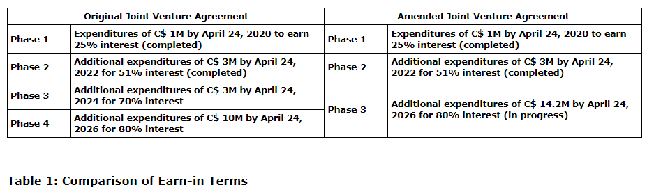 Under the amended joint venture agreement, the current earn-in phase for Cordoba has been adjusted to spend $14.2-million by April 24, 2026, for the option to earn an 80-per-cent interest in the Perseverance project. This adjusted project expenditure of $14.2-million reflects the combination of the phase 3 and phase 4 earn-in spending requirements in the original agreement. This adjusted earn-in phase includes additional project expenditures of $1.2-million for amending the agreement. The timing for Cordoba to have the option to earn the 80-per-cent project interest in Perseverance remains the same, but it is now accomplished by earning straight into the 80-per-cent project interest by April 24, 2026, rather than via two earn-in phases contemplated under the original joint venture agreement (refer to the table entitled "Comparison of earn-in terms" for comparison between the original and amended agreements).
