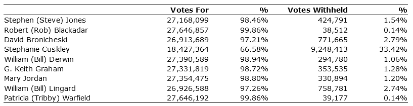 All nine director nominees proposed by management were elected. Proxies and in-person votes were received as shown in the attached table.
