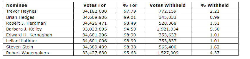 The following nominees were elected as directors of Black Diamond for the ensuing year, with the specific voting results being as shown in the attached table.