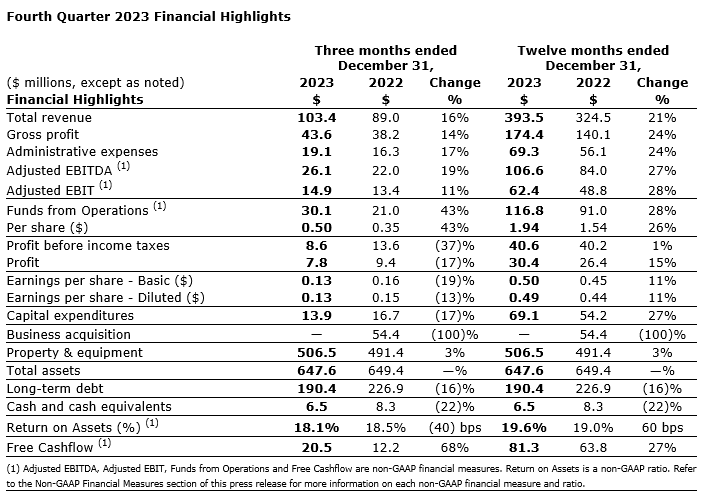 Long-term debt and net debt (1) were $190.4-million and $184.2-million, respectively, at the end of the year. Continued positive free cash flow (1) decreased long-term debt and net debt by $36.5-million and $34.7-million, respectively, from Dec. 31, 2022. Net debt to trailing-12-month (TTM) adjusted leverage EBITDA (1) of 1.7 times is now just below the company's target range of 2.0 times to 3.0 times while available liquidity was $142.6-million at the end of the year.