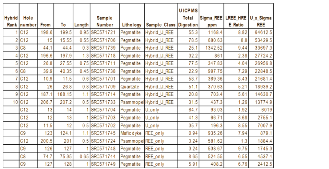 of intervals exhibiting coincident uranium and rare-earth element enrichment, and does not represent grade or economic significance. Reported results represent individual sample intervals and should not be interpreted as representative of average grades or as evidence of economic mineralization.