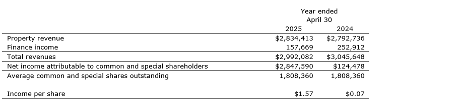 Total revenue for the year ended April 30, 2025, improved $53,566, compared with the year ended April 30, 2024, a result of both higher property revenue and finance income.