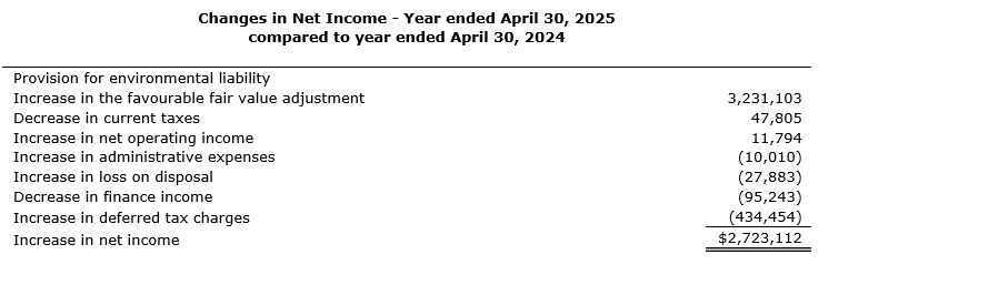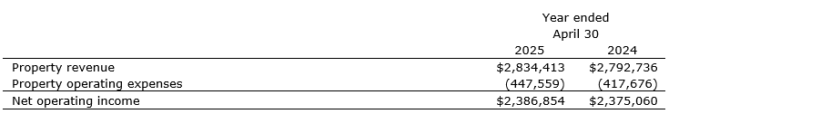 The net operating income (a non-IFRS financial measure) for the year ended April 30, 2025, was $2,386,854, a $11,794 increase compared with the previous year. This increase was primarily the result of improved property revenue related to higher recovery of operating costs from tenants.