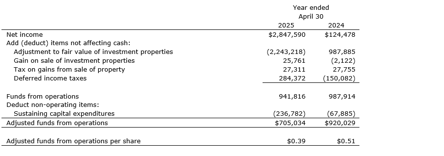 For the year ended April 30, 2025, the company recorded adjusted funds from operations of $705,034 (39 cents per share), compared with $920,029 (51 cents per share) in 2024.