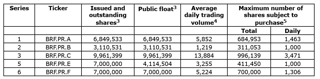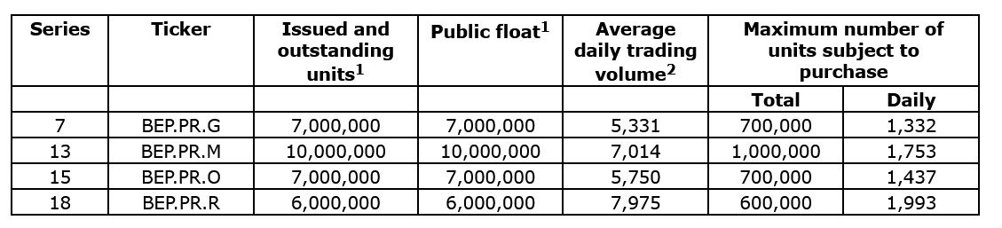 Under BEP's normal course issuer bid for Preferred Units, BEP is authorized to repurchase a total of approximately 10% of the public float of each respective series of the Preferred Units as follows: