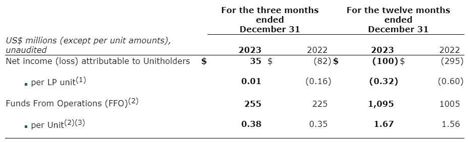 Brookfield Renewable generated record FFO of $1,095-million, or $1.67 per unit, for the 12 months ended Dec. 31, 2023, a 7-per-cent increase on a per-unit basis over the same period in the prior year, including solid fourth quarter results that increased 9 per cent per unit year-on-year. The results reflect the benefit of the company's diverse asset base, high-quality inflation-linked and contracted cash flows, organic growth, and contributions from acquisitions. After deducting non-cash depreciation and other expenses, Brookfield Renewable's net loss attributable to unitholders for the 12 months ended Dec. 31, 2023, was $100-million, or 32 cents per unit.