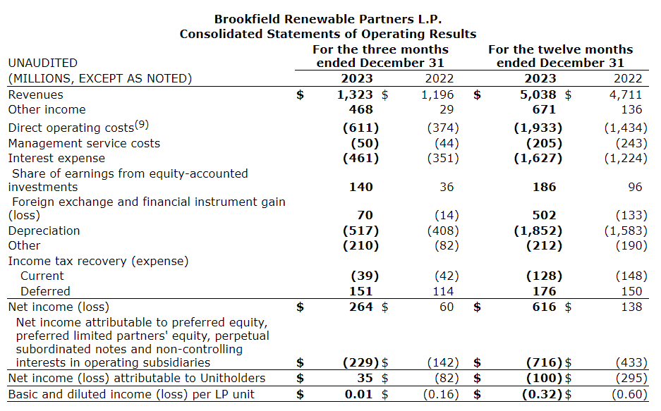 Brookfield Renewable Partners LP (BEP) has released its financial results for the three and 12 months ended Dec. 31, 2023.