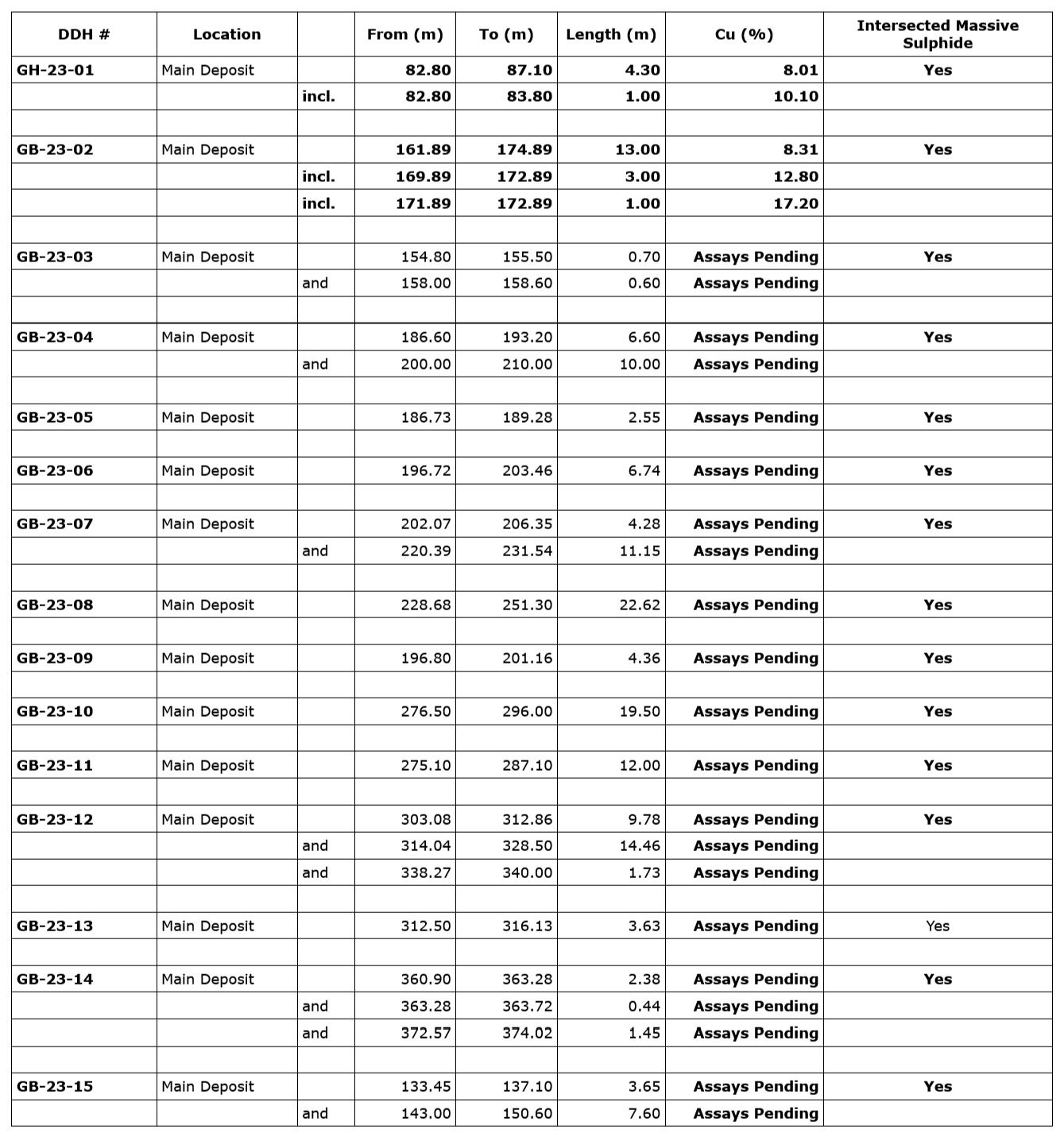 • GB20-05: 27.20 m of 8.06 per cent Cu, including 7.75 m of 16.88 per cent Cu;
