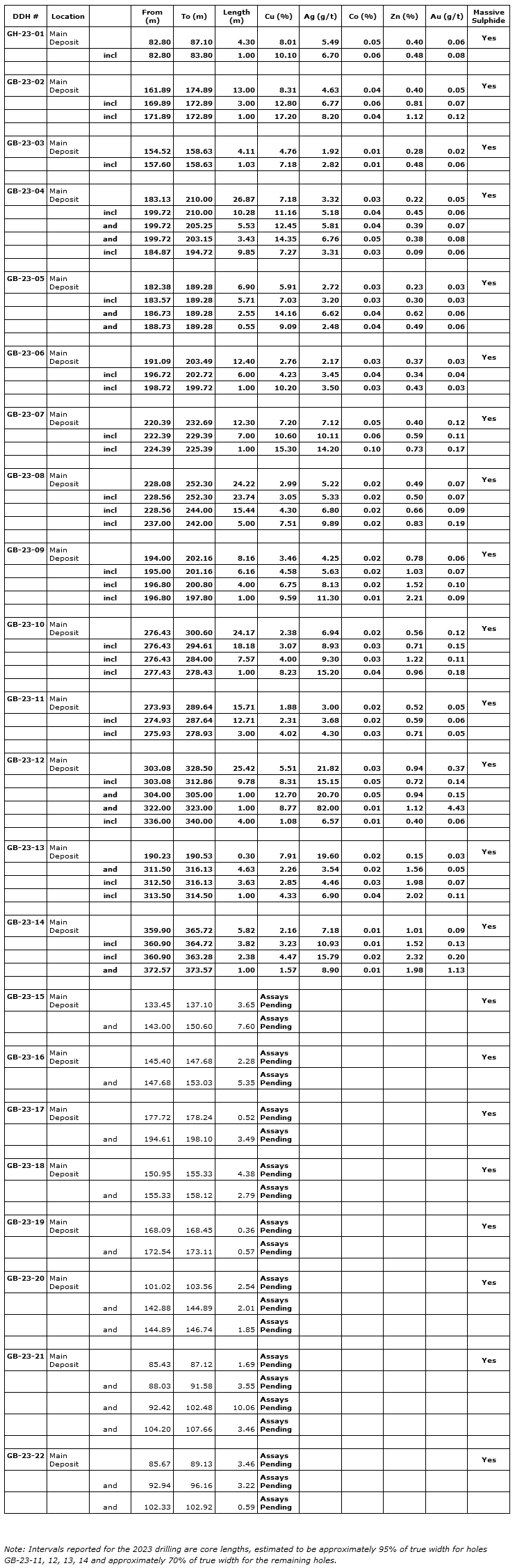 Benton Resources Inc. has received further impressive assay results from its recently completed phase 1 drill program at the Great Burnt copper deposit in south-central Newfoundland. The company's latest three drill holes have significantly expanded the continuity of the high-grade core along strike and down plunge, and it remains open to further expansion. GB-23-12, which cut 25.42 metres grading 5.51 per cent copper (Cu) is considered to be near the core of the high-grade lens, which is the deepest high-grade drill intersection on the Great Burnt deposit to date. An interval within this zone returned 8.77 per cent Cu, 4.43 grams per tonne (g/t) gold (Au), 82 g/t silver (Ag) and 1.12 per cent zinc (Zn) over one m. In addition, GB-23-13 and GB-23-14 also intersected the copper-rich zone, which is believed to be the up-dip and down-dip extension of the lens. Please see the attached summary table for the complete results to date.