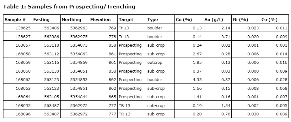See the table entitled "Samples from prospecting/trenching" for significant results from the two areas. The company will proceed to enlarge the exposures of selected mineralized zones to permit geological mapping and channel sampling as much as possible in the 2024 season.