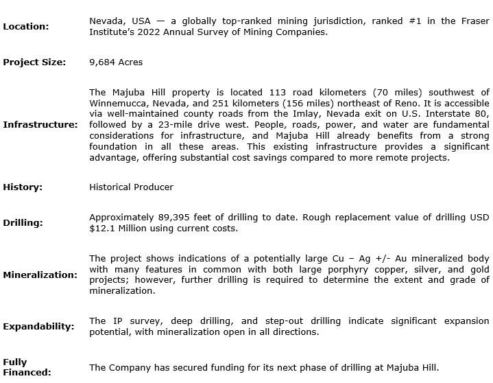 The company's flagship asset is the Majuba Hill copper, silver and gold district, located 156 miles (251 kilometres) from Reno, Nev. Majuba Hill benefits from a mining-friendly regulatory environment and strong local infrastructure. While still an exploration-stage asset, the geological footprint and scale of mineralization indicate that further work is clearly justified and that the system may host significant copper potential.