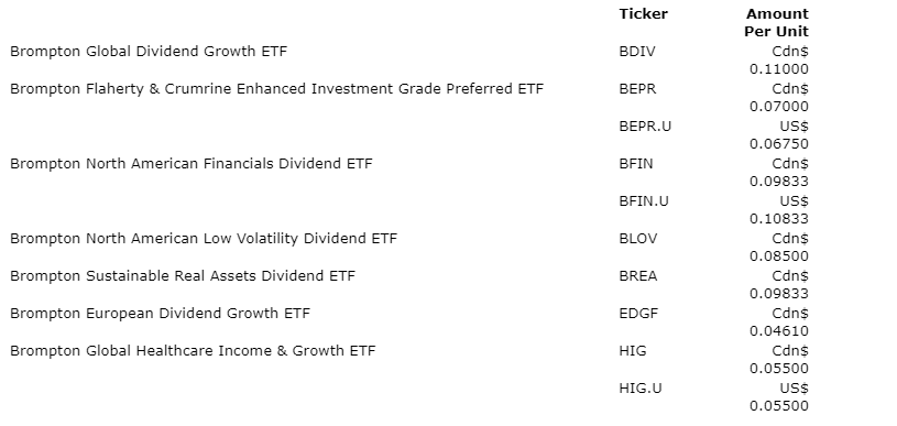 Brompton Funds announces monthly distributions for record dates from January to March, 2024, for each of exchange-traded fund (ETF) shown in the attached table.