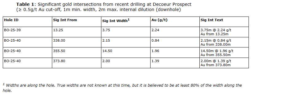 "We are delighted to have returned the best intercept at Decoeur with a single targeted drill hole. Hole BO-25-40 has confirmed a previously unrecognized geological interpretation at Decoeur and we are confident that further drilling with this strategy will provide an opportunity to upgrade the scale of the Decoeur prospect. Hole BO-25-39 has significantly extended the Decoeur gold mineralization to the east near surface and supports our interpretation the North Bousquet fault is a fundamental regional structure with previously unrecognized prospectivity for gold mineralization."