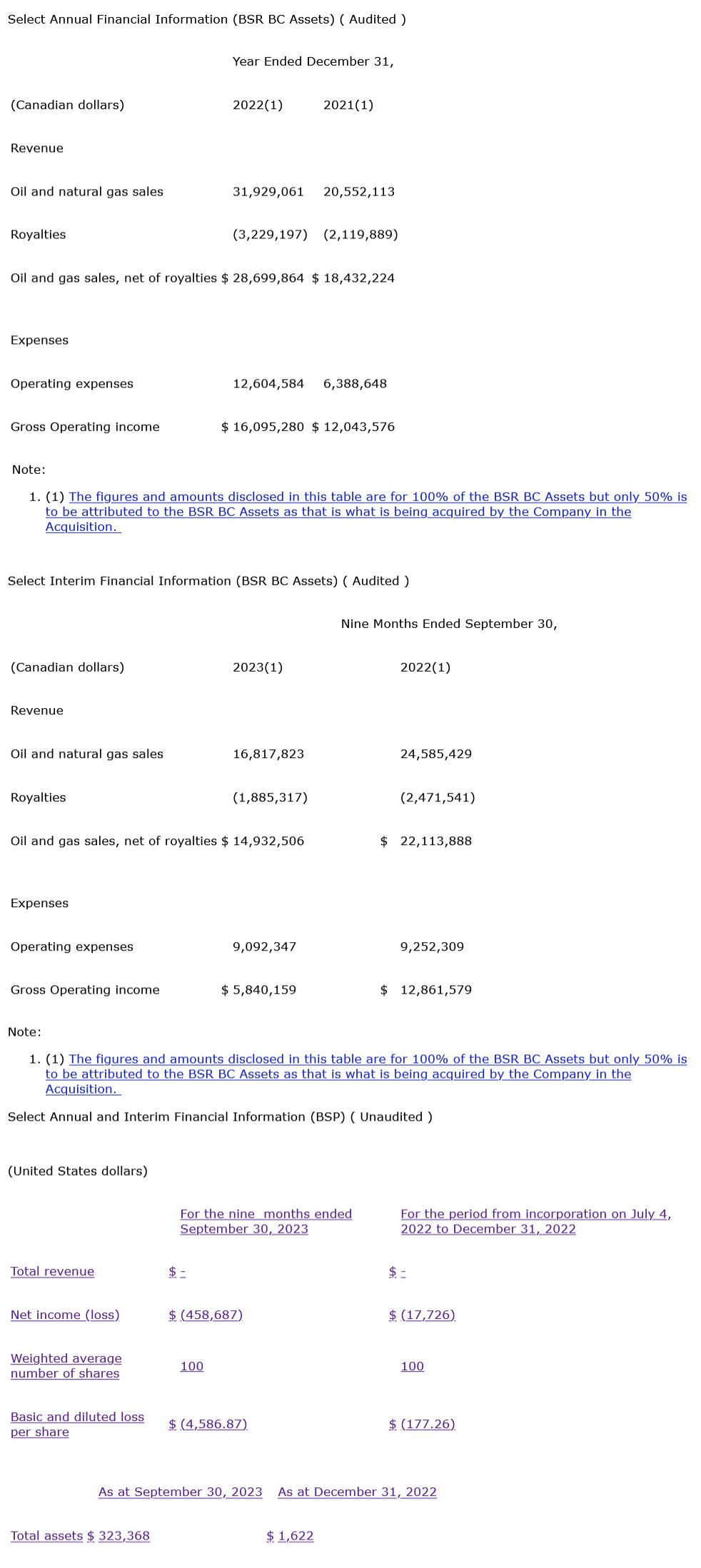 to the press release dated Nov. 22, 2023, relating to the company having entered into a definitive agreement dated Nov. 21, 2023, as amended and dated Feb. 27, 2024, with an non-arm's-length party, being Blue Sky Resources Ltd., which is an Alberta-based private oil and gas company (BSR) for the purchase of a 50-per-cent non-operating interest in certain oil and gas assets owned by BSR that are located in northeastern British Columbia and 100 per cent of the shares of Blue Sky Paus Ltd., which is an Alberta corporation that is a wholly owned subsidiary of BSR, that holds a production sharing contract (PSC) over offshore waters near Indonesia that may be prospective for oil and gas exploration. The Acquisition is being considered non-arm's length and a 'related party transaction' by the TSXV and is a 'reverse takeover' ("