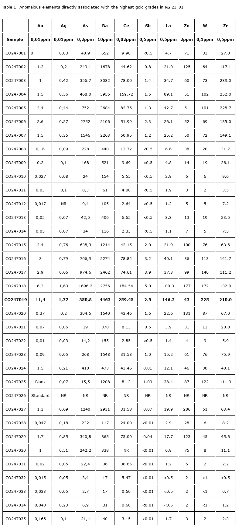 In the fall of 2023, a total of 88 soil samples were collected from six parallel grid lines spaced 100 meters apart. Out of the 36 chemical elements that were analyzed by pyroanalysis, 16 have been selected for their relevance in characterizing the Grondin gold-bearing zone. These elements are: Ag, As, Ba, Be, Cd, Co, Cu, Fe, La, Ni, Pb, S, Sb, Sr, V, and Zn. Predominantly, these are the elements that have shown anomalies in either the 35 lithogeochemical drill samples (as per the Drill Hole RG 23-01 press release on January 18, table 1) or within the 88 soil samples themselves.