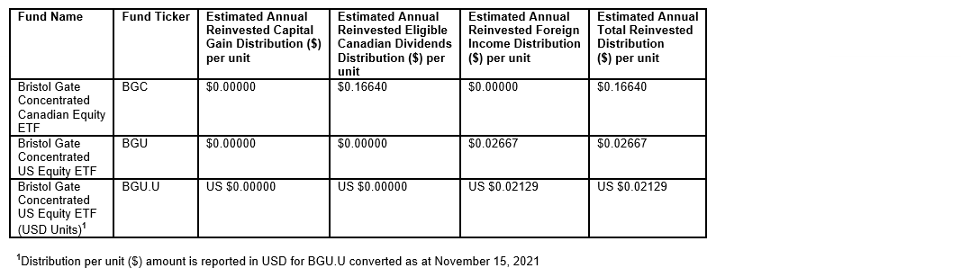 BRISTOL GATE CAPITAL PARTNERS INC. ANNOUNCES ESTIMATED ANNUAL REINVESTED DISTRIBUTIONS FOR BRISTOL GATE ETFS
