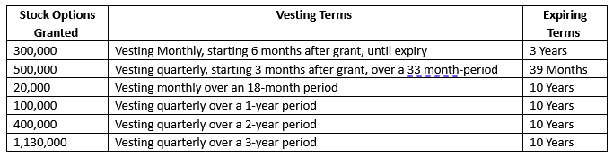 Bioharvest Sciences Inc. has granted a total of 2.45 million stock options: 1.95 million to consultants and employees, and 500,000 to officers of the company. The stock options granted are exercisable to purchase a common share of the company at a price of 28.5 cents per share as per the terms shown in the associated table.