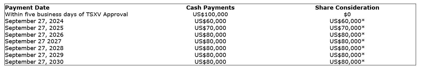 *The share consideration issuable pursuant to the Agreement will be based on the 10-day volume weighed average price ("VWAP") of the Company's common shares ("Common Shares") on the TSX Venture Exchange (the "TSXV") prior to the applicable payment date.