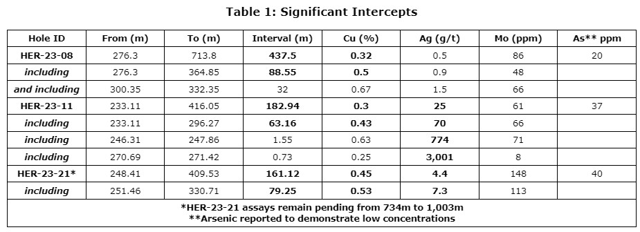 Chris Paul, chief executive officer and director of the company, noted: "Stepout holes drilled up to 500 m from the initial discovery hole, HER-23-05, have demonstrated significant scale to the system. We've drilled in all directions across a 450 m by 500 m area and every hole ended in mineralization. The system remains open in multiple directions and at depth, with new geophysical data suggesting the potential for significant expansion. Our 2023 drilling encountered a significantly large phyllic halo for which core photos have been posted to the company's website. The photos illustrate intense veining, sulphide mineralization and hydrothermal alteration reflective of the scale of the system. In exceptionally large porphyry coppers, the phyllic alteration can extend significant distances from a high-grade potassic core, and the intensity of veining is supportive of that.