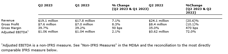 - Adjusted EBITDA was $1.06-million for Q2 2023, an increase of approximately $440,000 year over year. The increase is largely attributed to the company's focus on profitability and running efficient operations.