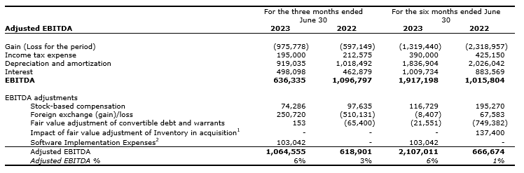 The company defines EBITDA as net income or loss before interest, income taxes and amortization. Adjusted EBITDA removes fair value adjustment of convertible debt and warrants, fair value adjustment of inventory, restructuring expenses, non-recurring bad debt expense, foreign exchange gains and losses, and share-based compensation items from EBITDA. The company is presenting these measures because it believes that its current and potential investors, and many analysts, use them to assess the company's current and future operating results, and to make investment decisions. Management uses these measures in managing the business and making decisions. EBITDA and adjusted EBITDA are not intended as substitutes for IFRS measures.