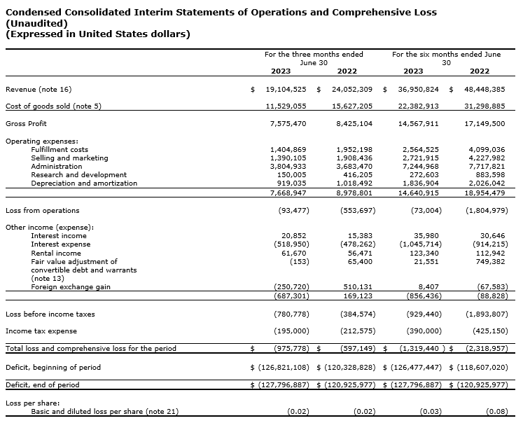 - Total revenue was $19.1-million for Q2 2023, a decrease of 20.6 per cent year over year and an increase of 7.1 per cent quarter over quarter. The decrease in revenue year over year is primarily driven by Builddirect's e-commerce business. Historically, Builddirect's e-commerce business has produced negative EBITDA (earnings before interest, taxes, depreciation and amortization), which was offset by strong positive EBITDA from its independent retailer businesses. In Q2 2022, Builddirect scaled back its e-commerce business and began implementing efficiency initiatives to improve the profitability of the e-commerce model. The increase in revenue quarter over quarter is due to e-commerce beginning to scale back up. At this point, Builddirect believes it is close to completing its efficiency initiatives and will soon be ready to grow its e-commerce business more aggressively.