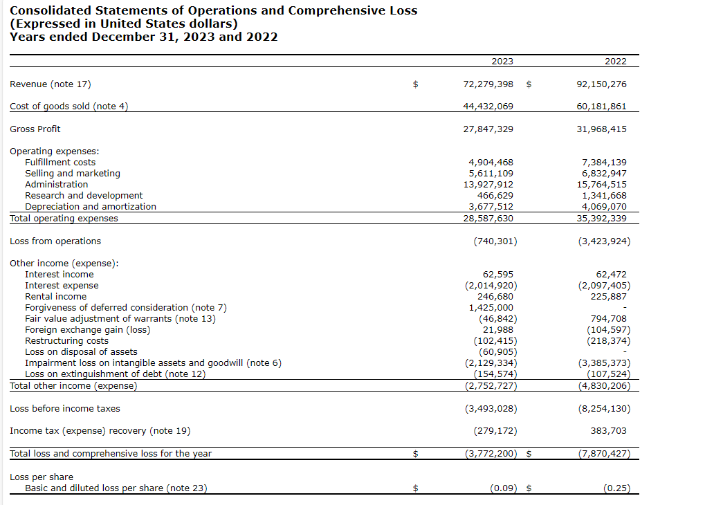 Total revenue was $16.9-million for Q4 2023, a decrease of 8.2 per cent and 22.1 per cent sequentially quarter-over-quarter and year-over-year, respectively. Over all, total revenue for FY 2023 was $72.3-million, a decrease of 21.6 per cent from prior year ended Dec. 31, 2022 (FY 2022), revenue of $92.2-million. The decrease follows from the company's strategy to temporarily scale down e-commerce operations to facilitate its platform migration and enhancements initiative. This initiative lowered systems operating costs and helped to create positive adjusted EBITDA (earnings before interest, taxes, depreciation and amortization) results to date.