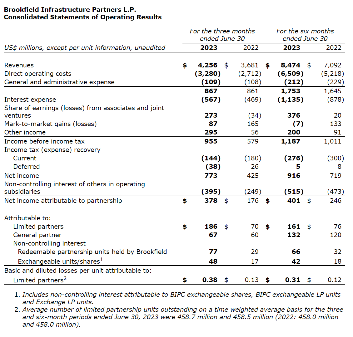 Brookfield Infrastructure Partners LP has released its results for the second quarter ended June 30, 2023.