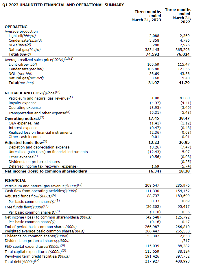Achieved quarterly average production of 74,592 boe/d, a 2% decrease from Q1 2022, notwithstanding an unplanned outage on Pembina Pipeline Corporation's Northern Pipeline system that significantly impacted the Corporation's NGLs sales volumes in Q1 2023.