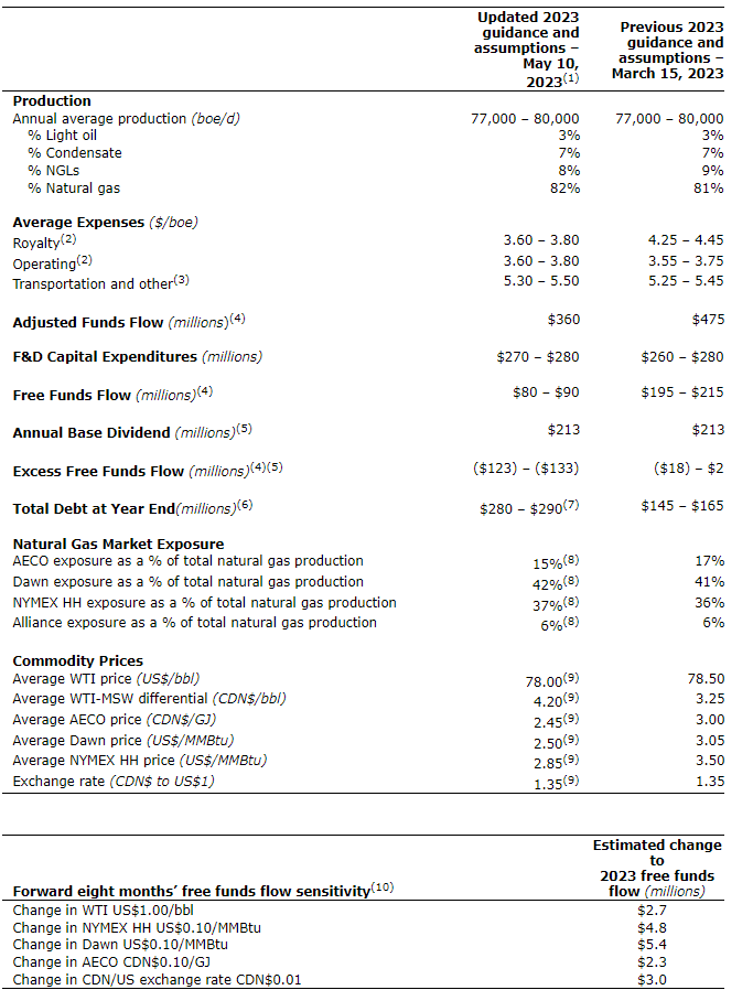 The following tables set forth Birchcliff's updated and previous guidance and commodity price assumptions for 2023, as well as its free funds flow sensitivity: