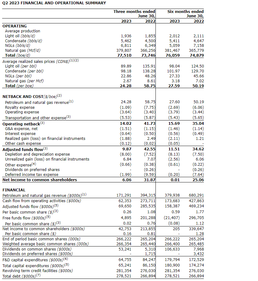 Achieved strong quarterly average production of 77,510 boe/d (barrels of oil equivalent per day), notwithstanding the impact of an unplanned system outage on Pembina Pipeline's Northern Pipeline system (the Pembina outage), which affected the corporation's production in Q2 2023. The strong performance from the new wells brought on production in the first half of the year helped to offset the negative impact of this outage.