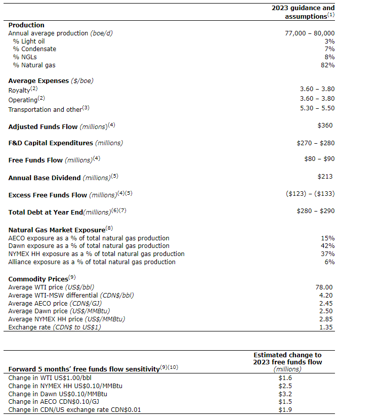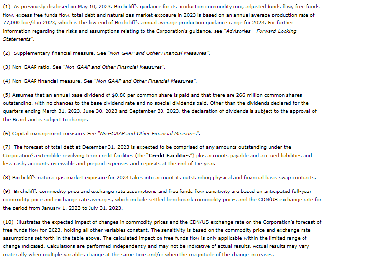 The attached tables set forth Birchcliff's guidance and commodity price assumptions for 2023 (which were previously disclosed on May 10, 2023), as well as its free funds flow sensitivity.