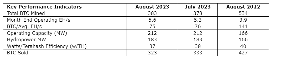 - 5.6 EH/s on-line as of Aug. 31, 2023, up 43.5 per cent from Aug. 31, 2022, and up 5.7 per cent from July 31, 2023;