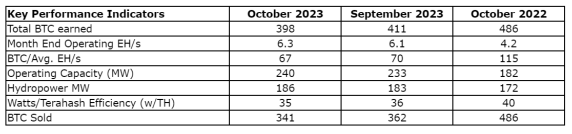 6.3 EH/s on-line as of Oct. 31, 2023, up 50 per cent from Oct. 31, 2022, and up 3.0 per cent from Sept. 30, 2023;
