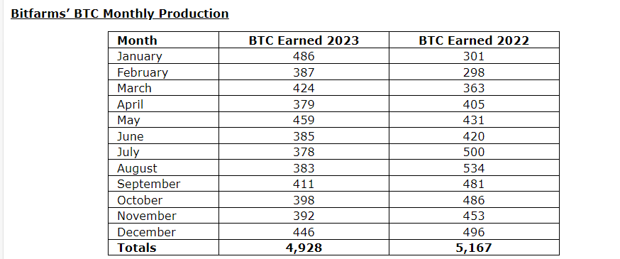 BITFARMS EARNS 446 BTC IN DECEMBER 2023 AND 4,928 BTC FOR THE FULL YEAR 2023